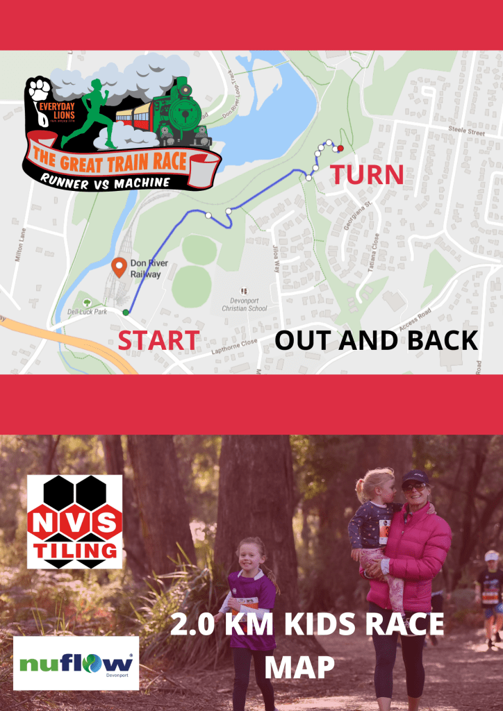 The Giant Devonport Kids 2 km race starts and finishes at the Don River Railway. Runners and walkers will run on the walking track through the Don Reserve and will turn at 1 km mark at the zig zag part of the track, before turning along the same track to the Don River Railway.